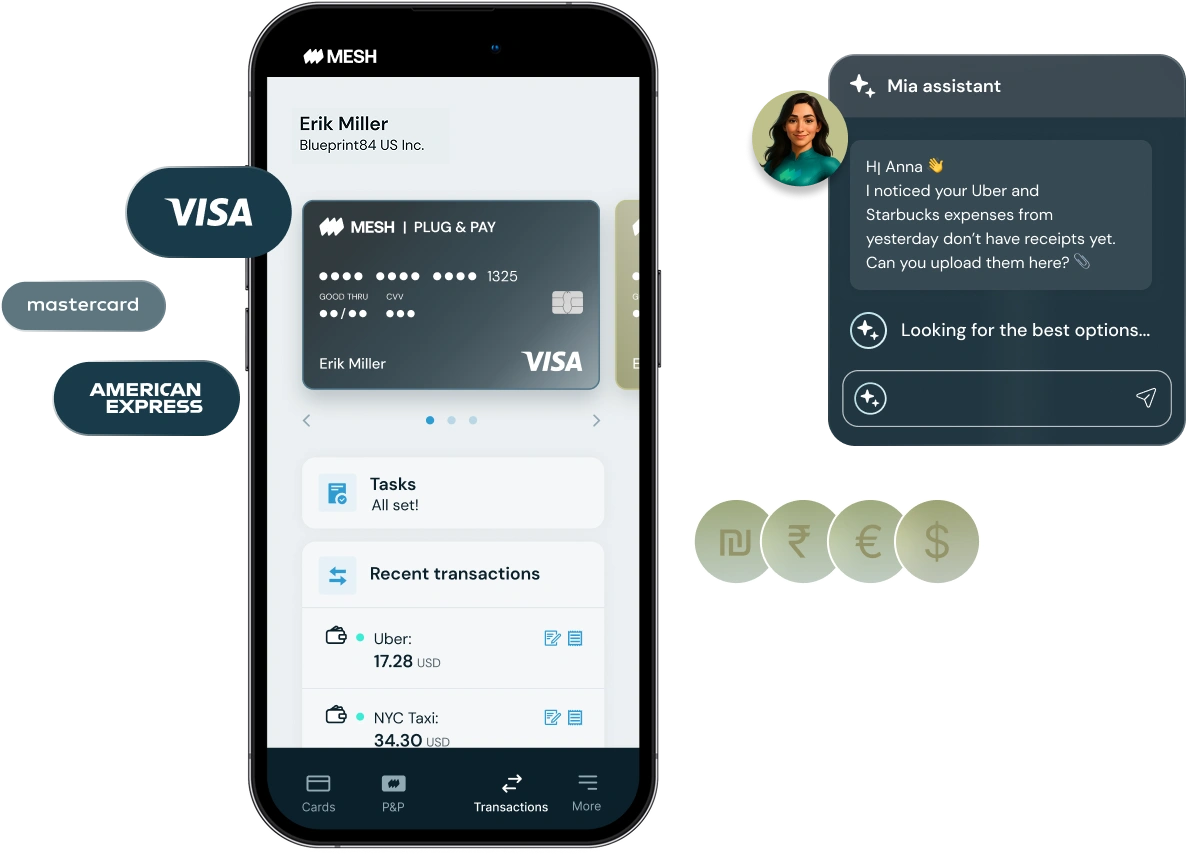 Card, expense and travel agnostic. Globally scaleable. Mesh unifies Card, expense and travel delivering precise control, endless flexibility and real-time visibility.