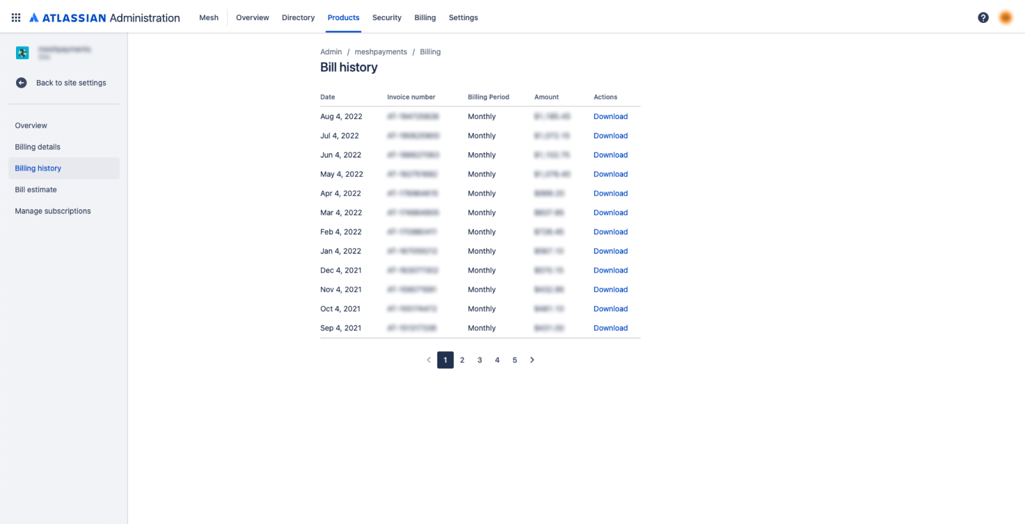 Choose “Billing” from the top bar and click “Manage subscription” next to the Atlassian product whose receipts you’d like to view.